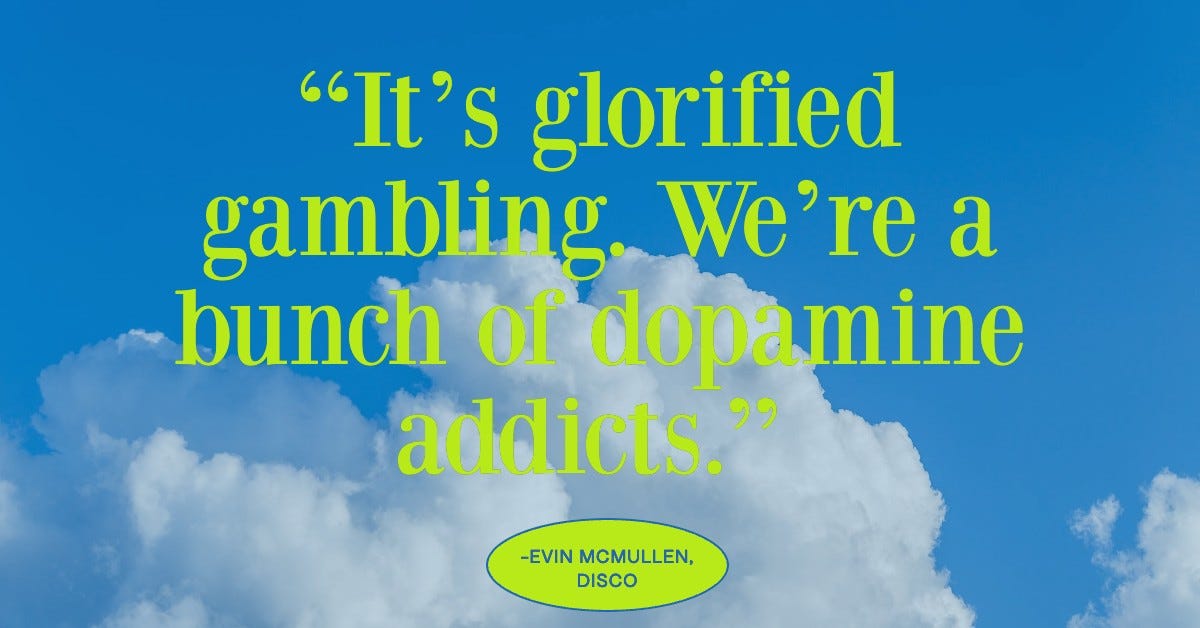 My favorite part of web3 life has to be the conversations; Internet strangers have been particularly open to riffing with me and I love it. One of the most enriching chats I’ve had was with Evin McMullen of Disco. She’s a sunbeam and you can’t help but get excited in her presence. But beyond the superior vibes, she also said something about the state of web3 that stuck with me: “It’s glorified gambling. We’re a bunch of dopamine addicts.”